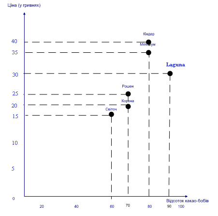 Провівши позиціонування нашої продукції відносно конкурентів ми зрозуміли, що вільною є ніша, де ціна на одиницю продукції коливається від 15 до 40 гривень та якістю продукції більше 80%, тому плануємо зайняти саме цю нішу, а саме: ціна - 30 гривень і якість(вміст какао-бобів) 90%.