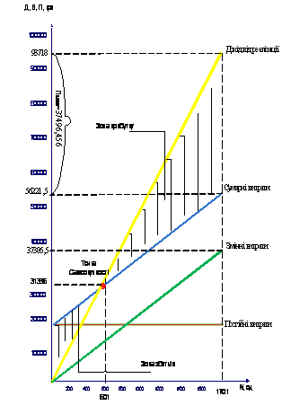 знайдено критичний обсяг збуту продукції (Nкр = 601 одиниця), тобто точку самоокупності фірми, яка є межею між зонами видатків та прибутків.