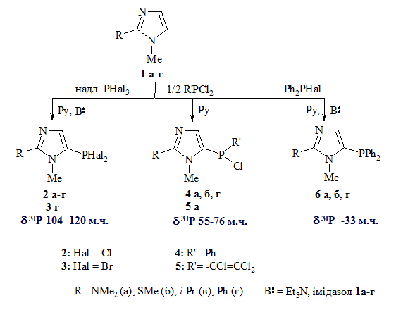 Фосфорилювання 1-метил-2(R)-заміщених імідазолів галогенідами фосфору (III). Синтез та хімічні властивості 5-фосфорильованих 1-метил-2(R)-імідазолів.