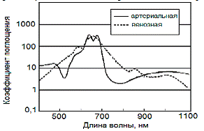 Оптимальным диапазоном излучения в задачах регистрации сигнала артериальной пульсации крови является диапазон видимого и ближнего инфракрасного света. На рис. 5 приведен спектр поглощения света венозной и артериальной кровью в диапазоне видимого и ближнего инфракрасного света. Анализ приведенных кривых спектра поглощения позволяет сделать вывод о
