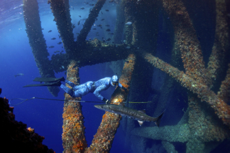 Это нефтяные платформы в Мексиканском заливе, где можно заняться подводной охотой. Любая чужеродная структура в океане притягивает к себе подводную живность, даже если вы найдете в воде бревно, то увидите, сколько живности прячется под ним, и сколько там рыбы, которая по этой живностью охотится. Нефтяные вышки в Мексиканском заливе с их сложными системами опорных балок – это настоящий рай для обитателей океана, и очень опасное место для фридайвера. Комфортно себя здесь могут чувствовать только особые люди, и это место уж точно не подходит для рядового пловца.