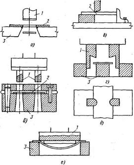 Рисунок 13.3.8 - Конструкция штампов различного назначения: а - вырубной штамп; б - вырубной штамп с направляющей и фиксирующей плитой; в, г - обрубной штамп; д - подрубной штамп; е - кромкоотрубной штамп; / - пуансон; 2 - заготовка; 3 - матрица.