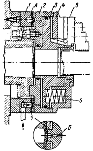 Описание работы кулачка: воздухоприемное кольцо I неподвижно закреплено через промежуточное кольцо на торце бабки станка, а корпус 2 патрона центрируется на фланце шпинделя и закрепляется гайками с помощью поворотной шайбы. С правой стороны корпус-цилиндр закрыт крышкой 4, в которой имеются обычные радиальные пазы под кулачки 5. На ступице поршня 3 образованы три продольных паза, расположенных относительно друг друга под углом 120° и наклоненных по отношению к оси на 15°. В эти пазы заходят концы кулачков, образуя несамотормозящие клиновые соединения. При линейном перемещении поршня сцепленные с его пазами кулачки совершают перемещения в радиальном направлении, зажимая или освобождая обрабатываемую деталь. В этой части конструкция патрона аналогична конструкции клинового патрона.