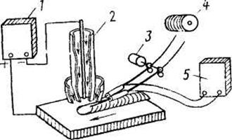 Рисунок 13.1.7.2 - Схема плазменной наплавки: 1 - источник питания постоянного тока; 2 - плазменная горелка; 3 - электродвигатель для подачи проволоки; 4 - наплавочная проволока; 5 - источник переменного тока для подогрева проволоки.