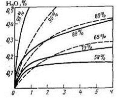 Рисунок 13.2.1.2 - Зависимость содержания поглощенной влаги Н2О в электродах с покрытием основного типа от продолжительности (t) выдержки их на воздухе с разной относительной влажностью: ----- - электроды для наплавки высокопрочной стали Ф5 мм (23-26°С); ____ - электроды для наплавки высокопрочной стали, Ф4 мм (20°С).