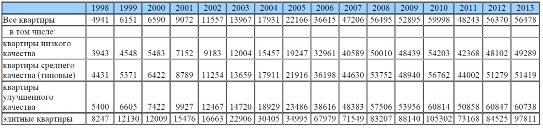 В период с 2010 по 2013 год наблюдается повышение средних цен на первичное жилье с 48 144 рублей до 50 208 рублей и падение средних цен на вторичное жилье с 59 998 рублей до 56 478 рублей (рисунки 3.2, 3.3). Эти изменения цен можно увидеть на графике 1, здесь же мы видим, что в 2011 году все средние цены на жильё резко упали и начали подниматься только в начале 2012 года. Такие изменения уровней цен на жильё обусловлены положением на рынке недвижимости. Цены на рынке недвижимости зависят от многих факторов, в частности - от ситуации в стране, насыщенности рынка, предпочтений покупателей, затрат на строительство, хозяйственной и социальной политики государства в области жилищного строительства.