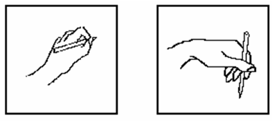Подавляющее большинство людей при письме располагают руку таким образом, что она находится ниже строки (рис. 3, левое изображение). Однако некоторые люди, пишущие левой рукой, располагают ее над строкой (рис. 3, правое изображение).