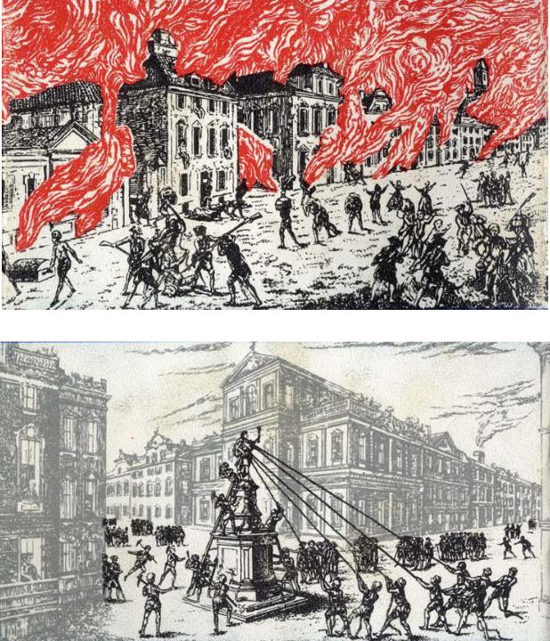 Гравюра, изображающая участников демонстрации 10 июля 1776 г. в НьюЙорке, низвергающих статую английского короля Георга III