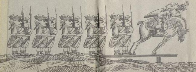 Британский отряд, остановленный 'Сынами свободы' поднятием моста через реку и сорвавшими таким образом карательную операцию англичан. Карикатура худ. Э. Сореля