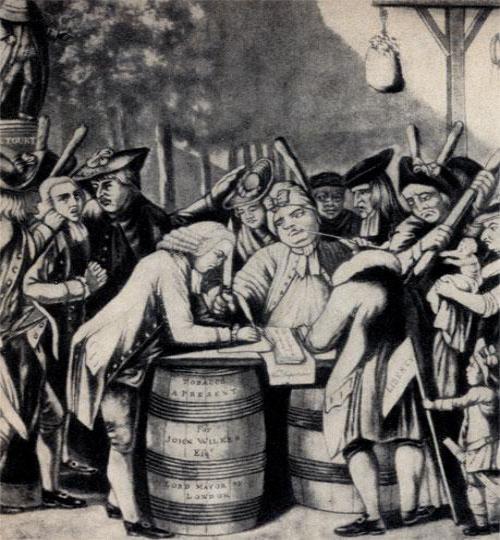 Народ принуждает купцов дать подписку не торговать с Англией Британская карикатура 1775 г.
