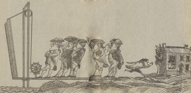 'Сыны свободы', подняв мост, предотвратили карательную операцию английских войск против американских повстанцев. Карикатура худ. Э. Сореля