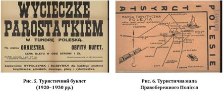 На одній із таких туристичних мап вказано, що відправним пунктом подорожей Поліссям було місто Пінськ (сучасне місто на півдні Білорусі), а вже звідти формувалися різні туристичні маршрути Поліссям (рис. 7). Щоб зацікавити туристів та краєзнавців, в оголошеннях Полісся порівнювали з Поліською тундрою. Для відпочиваючих на пароплаві пропонували оркестр, танці, буфет, пляжі, риболовлю. Ціна такої подорожі коштувала один - два злоті.