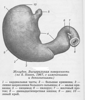 Желудок имеет серозную оболочку, которая с малой кривизны переходит в малый сальник, а с большой кривизны - в большой сальник. Большой сальник покрывает вентральную брюшную стенку и таким образом отделяет ее от кишечных петель. Имеет мышечную оболочку, построенную из неисчерченной мышечной ткани, образующей три слоя: продольный, косой и циркулярный. Продольный слой довольно тонкий, располагается поверхностно на большой и малой кривизнах и направлятся от пищевода к пилорусу. Циркулярный или круговой слой мышечных пучков проходит в правой большей части желудка. За счет этого слоя формируется сфинктер пилоруса. Косой слой мышечных пучков преобладает главным образом в левой части желудка. Слизистая оболочка желудка кишечного типа на всем протяжении содержит железы и покрыта однослойным цилиндрическим эпителием. Граница между слизистой оболочкой пищевода и желудка лежит при входе в желудок.