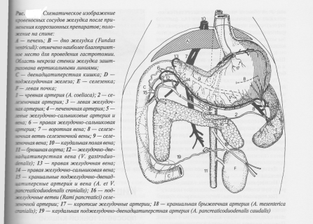 Кровоснабжение. На желудке различают малую и большую кривизну, на которых находятся крупные кровеносные сосуды левой желудочковой артерии (a.gastrica sinistra) - проходит по малой кривизне желудка, отдавая ветви в стенку желудка и к пищеводу. Левая желудочковая артерия является ветвью чревной артерии (a.celiaca). Надчревная передняя артерия (a.epygastrica cranialis) служит продолжением грудной внутренней артерии. Выходит на брюшную стенку между реберной дугой и мечевидным хрящом на уровне 4 ребра. Далее она следует по середине внутренней поверхности прямой мышцы живота или в 2..3 см от ее наружного края.