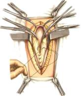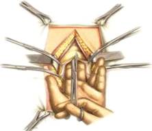 него вводим в брюшную полость два пальца и под их контролем удлиняем ножницами