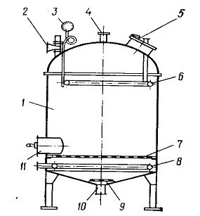 подачи пара; 9 - сетка с диаметром 250 мм; 10 - спескной патрубок; 11 -