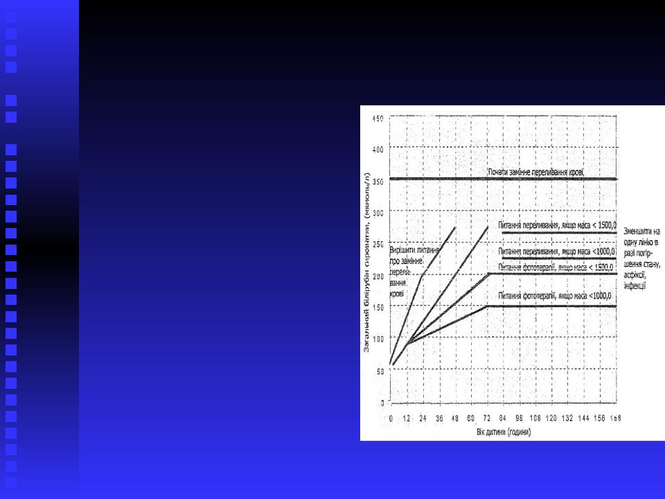 -Співвідношення рівня загального білірубіну сироватки крові (мкмоль/л) та альбуміну (г/л) в залежності від маси дитини: менше 1250 г – 6,8; 1250-1499 г – 8,8; 1500-1999 г – 10,2; 2000-2500 г – 11,6; більше 2500 г – 12,2.