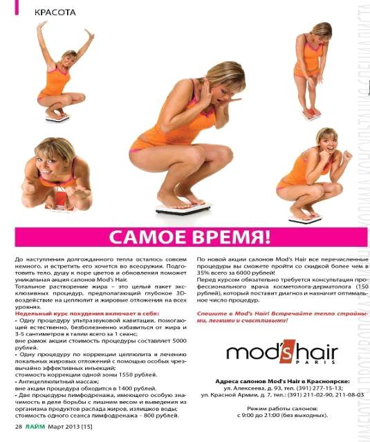 Картинку поддерживает и рекламный слоган: «Спешите в Mod`s Hair!Встречайте тепло стройными, легкими и счастливыми!».
