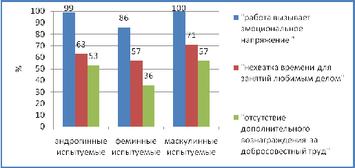 Выдвинутая гипотеза о том, что существуют гендерные особенности эмоционального выгорания женщин профессий типа «человек-человек», а именно: у женщин с выраженными маскулинными характеристиками наблюдается низкий уровень эмоционального выгорания, у женщин с выраженными феминными характеристиками - высокий уровень и у женщин с выраженными андрогинными характеристиками - средний уровень эмоционального выгорания, подтвердилась частично. Возможно, это связанно с недостаточной численностью испытуемых, а также это влияние внешних факторов развития синдрома. Таких как: отсутствие реальной государственной поддержки, обесценивание престижа профессии, давление администрации, отсутствие помощи профсоюзов, низкий уровень материального дохода, плохие условия труда.