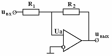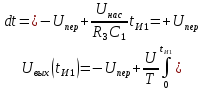 Интегратором называется устройство, временная зависимость напряжения на выходе которого пропорциональна интегралу по времени входного напряжения. Его схема может быть выполнена по схеме инвертирующего усилителя при замене резистора в цепи обратной связи на конденсатор C, как показано на рис. 1.3.
