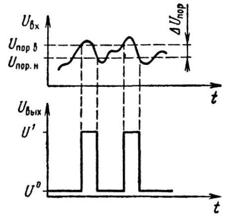В процессе нарастания напряжения входного сигнала Uвх, его значение сначала достигает нижней границы области гистерезиса Uпор.н, нижнего порога, при этом на выходе как и прежде ничего не изменяется. И даже когда входное напряжение Uвх заходит в область гистерезиса, и в течение некоторого времени находится внутри нее, то на выходе все равно ничего не происходит – на выходе по-прежнему напряжение низкого уровня U0.