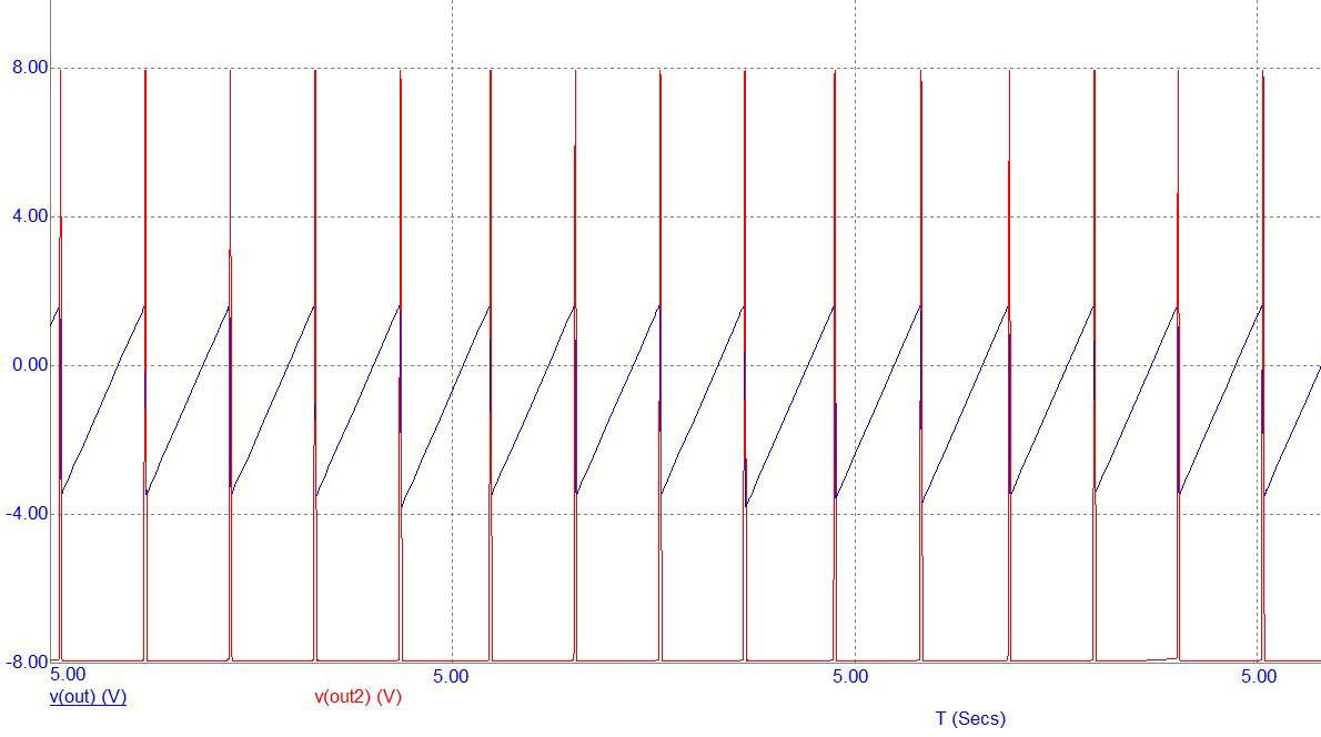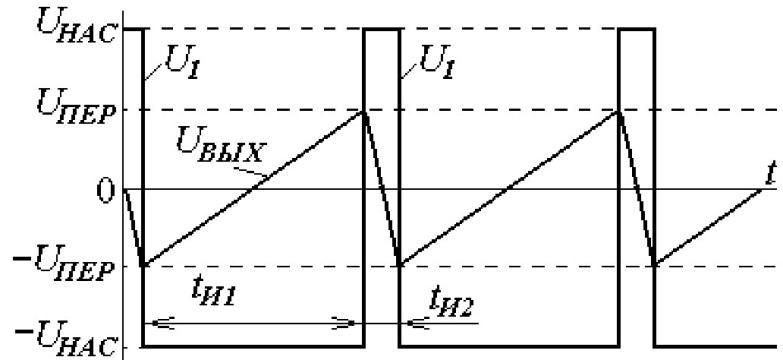 т. к. схему делаем несимметричной, взяв постоянные интегрирования разные для положительного и отрицательного напряжения, то пила становится несимметричной: