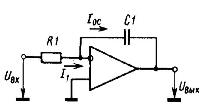 В схеме интегратора входной сигнал Uвх подается на инвертирующий входной зажим; неинвертирующий входной зажим заземлен. Входной сигнал формируется через входной резистор R1. Интегратор аналогичен инвертирующему усилителю за исключением одной особенности: вместо резистора в цепи обратной связи у него имеется конденсатор. Этот конденсатор C1 называется конденсатором цепи обратной связи.