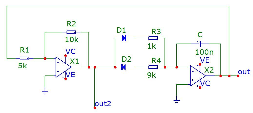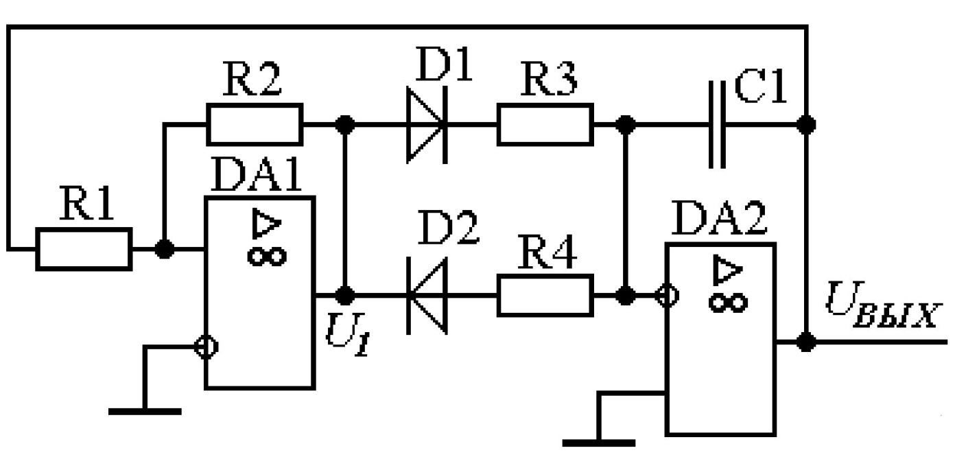 Схема генератора изображена на рисунке 1. Он состоит из триггера Шмитта на операционном усилителе DA1, и из интегратора, собранного на операционном усилителе DA2. Оба ОУ соединены последовательно через диодно-резисторные цепи D1, D2, R3, R4 и с помощью резистора R1 схема охвачена обратной связью.
