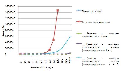 Сравним эффективность решения задачи коммивояжера с помощью генетического алгоритма с эффективными методами решения на одинаковых наборах данных. Для решения задачи коммивояжера с помощью минимального остова без(с) оптимизацией была использована программа, написанная на С++. В качестве алгоритма построения минимального остова был использован алгоритм Прима. Далее к решению, полученному с помощью минимального остова, применялась оптимизация: для участка пути длинной