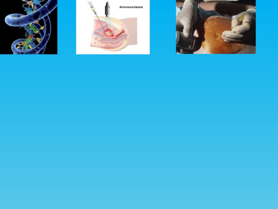 •В настоящее время в медицине применяют метод амниоцентеза – исследования клеток околоплодной жидкости, который позволяет обнаружить аномалии в числе и строении хромосом у плода уже на 16-й неделе беременности. Для этого берут пробу околоплодной жидкости путем пункции плодного пузыря.
