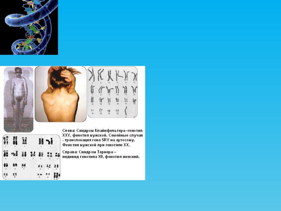 К таким болезням относятся, в частности, синдром Клайнфельтера, который встречается у одного из 400–600 новорожденных мальчиков. При этом заболевании половые хромосомы представлены набором ХХY. Синдром Клайнфельтера проявляется в недоразвитии первичных и вторичных половых признаков