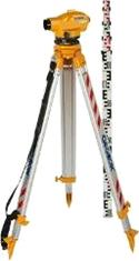Нивелиром называют прибор для определения превышений методом геометрического нивелирования с помощью визирного луча и двух вертикальных реек с делениями. На рисунке 7 представлен оптический нивелир закрепленный на штативе, а также различные виды нивелирных реек: алюминиевая телескопическая с сантиметровыми делениями, деревянная двухсторонняя с шашечными делениями, штриховая для цифрового нивелира, круглый уровень, которым снабжается нивелирная рейка.