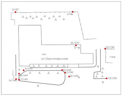 Из них закреплены на местности, с помощью металлической трубы диаметром 20 мм, лишь пять точек: 1-96, 2-97,7-145, 13-139 и 15-138. Остальные точки не закреплены межевыми знаками и находятся в асфальтовом покрытии.