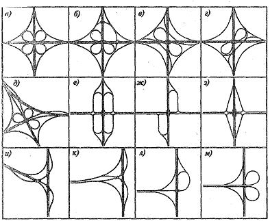 Рисунок 2 - Схемы развязок движения на пересечениях и примыканиях автомобильных дорог разных уровнях: