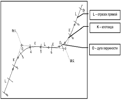 Трасса автодороги обычно представляет собой набор прямых (L), полных несмещенных клотоид (K) и дуг круговых кривых (O).