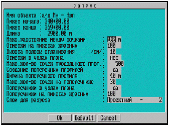 В этой таблице Пользователь может указать первоначальное значение параметров создаваемого объекта, т.е. имя, тип линии, ее цвет и толщину, номер условного знака, которыми изображается объект, характер отображения пикетов, начальный пикет и т. д. После построения объекта запрос о параметрах будет содержать именно эти текущие параметры, которые можно изменить для данного объекта.