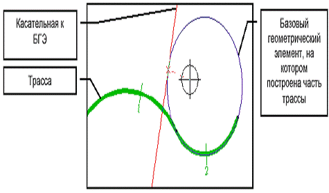БГЭ хранится в базе объекта вне слоев CREDO_MIX, так как вычерчивание и экспорт их не имеет смысла. Построенные на БГЭ видимые элементы или трассы вносятся в список активного слоя. На одном БГЭ можно создать несколько ВЭ или участков трасс в различных слоях геометрии. При работе с трассой геометрические построения производятся не со всей трассой, а с выбранным геометрическим элементом, на котором построена трасса. В частности, невозможно, перемещая курсор по всей трассе, получить касательную в разных точках трассы. Можно построить касательную только к определенному геометрическому элементу, составляющему трассу, при этом точку касания можно получить и за пределами трассы, но, конечно, в пределах БГЭ.
