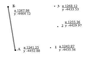 Рисунок 18. Разбивочный чертёж по координатам: А-Б базисная линия; 1,2,3 - находимые точки.
