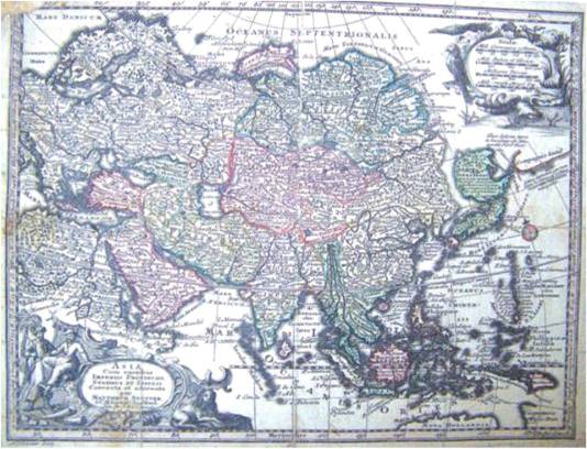 На карті «Азія...» території представлено Туреччиною, Ара- бією та Персією на заході; Китаєм, Індією, частиною Монгольської імперії на півдні; Монгольською імперією та частково Китаєм у центрі; зі сходу - японські острови, серед яких о. Хоккайдо («Terra Yedso»); на півночі та сході - землі Російської імперії. Землі омиваються Північним океаном, Східним океаном,