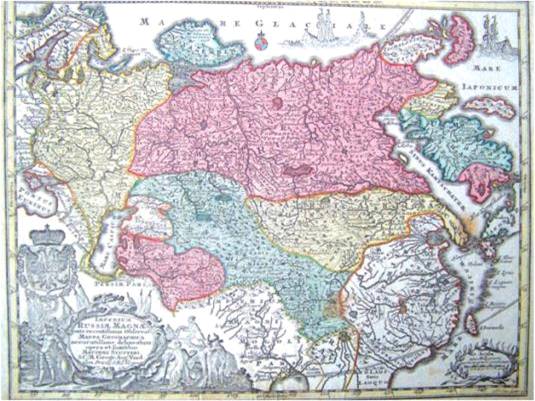 Територія Російської імперії репрезентована на заході Моско- вією, центральною та східною частинами України, на півдні - частиною Азії (Бухарський емірат, Монголія, Калмицьке ханство), на півночі та в центрі - територією Сибіру, Новою Землею із зимовищем Якоба ван Хемскерка, 1596 р., на сході - Камчаткою з Ку- рильськими та Олюторськими островами.