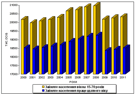 Кількість зайнятого населення віком 15-70 років в Україні у 2009 р., порівняно з 2008 р., зменшилась на 780,8 тис. осіб, або на 3,7% та становила 20,2 млн. осіб (рис. 2.1), з яких особи працездатного віку складали 18,4 млн., або 91,0%. Рівень зайнятості населення віком 15-70 років відповідно знизився за означений період в цілому по Україні з 59,3% до 57,7%, а у населення працездатного віку з 67,3% до 64,7% [72]. До 2011 р. спостерігається поступове зростання зайнятого населення в Україні. На наш погляд, існує дві причини пояснення даної тенденції. Перша з них демографічна. Так, кількість зайнятих в Україні зменшується за рахунок досягнення працездатного віку особами, народженими в 90-ті роки минулого століття, коли народжуваність різко скоротилася. Друга причина - економічна. Вона полягає в тому, що саме у 2008 році почалася світова економічна криза, що і призвела до зниження як кількості зайнятого населення, так і рівня зайнятості в країні. Ще однією причиною такого зменшення кількості зайнятих виступають міграції населення України за кордон.