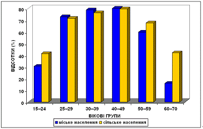 50-59 та 60-70 років існують суттєві відмінності (рівень зайнятості у сільській