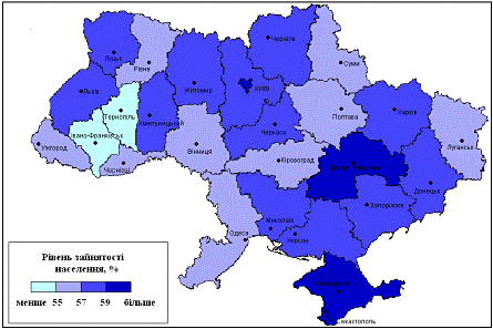 Зниження рівнів зайнятості населення спостерігалось у всіх регіонах країни. Найбільше зменшення зазначеного показника зафіксовано у Сумській (на 3,9 %), Донецькій (на 3,4 %), Закарпатській (на 3,0 %) областях. На наш погляд, це пов'язане зі світовою економічною кризою. Найвищий рівень зайнятості у 2011 р. був у м. Києві (63,1%) та м. Севастополі (61,1%), а найнижчий - у Івано-Франківській (51,9%) та Тернопільській (52,9%) областях (рис. 2.5) [72]. В цілому ж якщо розглянути рівень зайнятості населення в територіальному аспекті, то можна сказати, що в Україні він досить нерівномірний (рис. 2.5). Це пояснюється різною господарською спеціалізацією регіонів України.