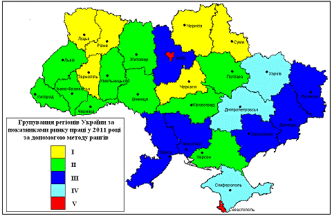 До першої групи потрапили Волинська, Рівненська, Сумська, Тернопільська, Черкаська та Чернігівська області. В цілому для неї характерні досить низькі показники кількості фізичних осіб на 10 000 населення, кількості юридичних осіб на 10 000 населення, підготовки кадрів, частки навчених новим професіям до загальної кількості працівників, рівня безробіття населення. Для групи характерні нижчі за середні густота населення, питома вага населення в працездатному віці, навантаження на одне вільне робоче місце, середня номінальна заробітна плата. В той же час близькими до середніх є показники рівня працевлаштування, рівня прийому робочої сили до середньооблікової кількості штатних працівників, рівня вибуття робочої сили до середньооблікової кількості штатних працівників, підвищення кваліфікації кадрів, навчено до загальної кількості працівників, рівня вимушеної неповної зайнятості, рівня економічної активності населення, рівень зайнятості населення. Виняток за більшістю показників становить Сумська область, проте за сумарним рейтингом вона входить саме до цієї групи. Такі показники свідчать про невисокий рівень розвитку ринку праці в даній групі. На наш погляд, органам місцевої влади необхідно звернути посилену увагу на регулювання ринку праці даних регіонів, адже в подальшому ситуація може погіршуватися [52, 72, 73].