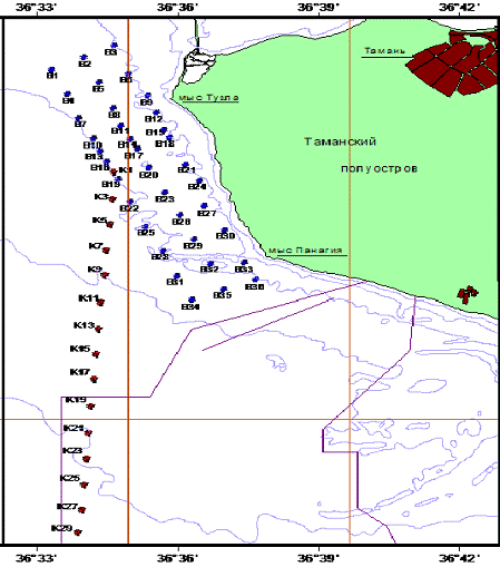 Объектом исследования данной работы является акватория Керченского пролива. Постановка задачи связана с созданием нового глубоководного порта на Таманском полуострове, интегрированного в МТК «Север-Юг» и дополняющего портовые мощности. В связи с предстоящим строительством проводится серия анализов проб вод и донных отложений с целью оценки экологической ситуации в целом, загрязнения отдельными токсикантами в настоящий момент и планирования последующего мониторинга. Особый интерес представляет прогноз возможного вторичного загрязнения воды Керченского пролива тяжелыми металлами в результате их перехода в водную фазу из донных осадков при проведении планируемых работ, в связи с чем исследуется не только поверхностный слой отложений, но и проводится опробование по скважинам.