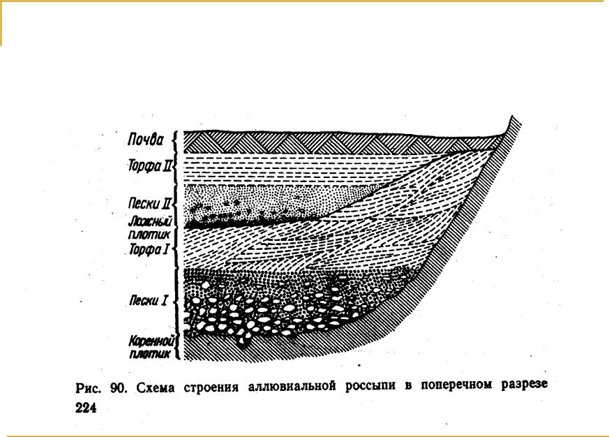 Плотиковый – проявляется при наличии плотных пород на пути вертикальной миграции обломочных частиц. В результате образуются повышенные концентрации тяжелых минералов (аллювиальные россыпи золота, платиноидов, касситерита и др.).