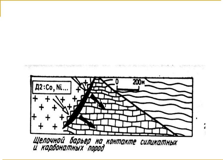 Кислый – проявляется на участках среды миграции, где происходит смена нейтральной или щелочной среды на кислую. Обусловлен понижением pH. Имеет значение для концентрации анионогенных элементов (Si, Ge, Mo). Роль барьера в образовании руд и аномалий меньше, чем щелочного.