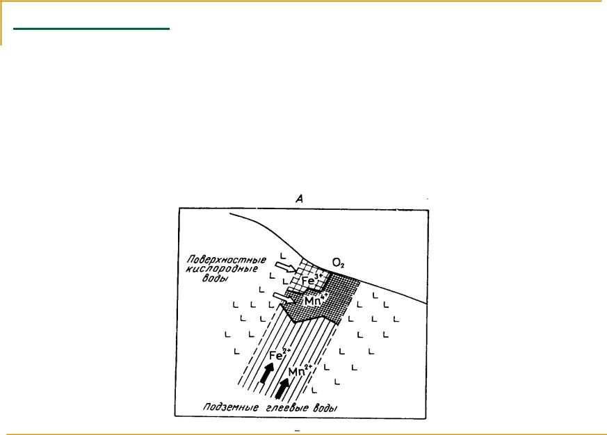 Окислительный – проявляется на участках миграции, где происходит резкая смена восстановительных условий на окислительные. Обусловлен повышением Eh.