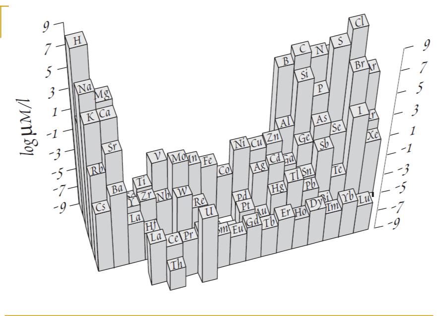 Состав морской воды. Наиболее распространенными являются элементы по бокам периодической таблицы. Элементы