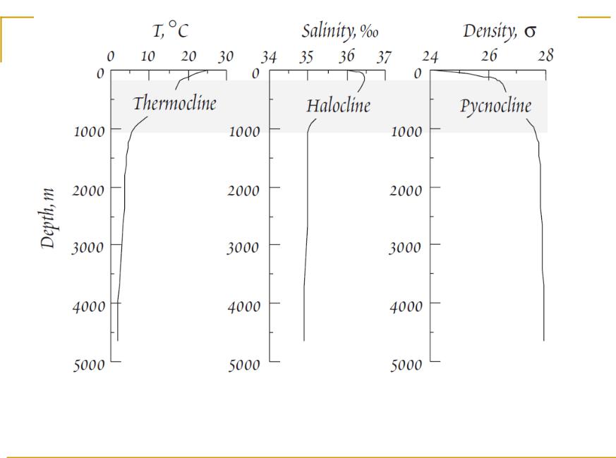 Температура, соленость и плотность вариации станции GEOSECS от 25 до 58º с.ш. в Северной Атлантике. Серые области показывают, положение постоянного термоклина и пикноклина. Инверсии в профиле солености вблизи поверхности указывают на превышение осадков над испарением.